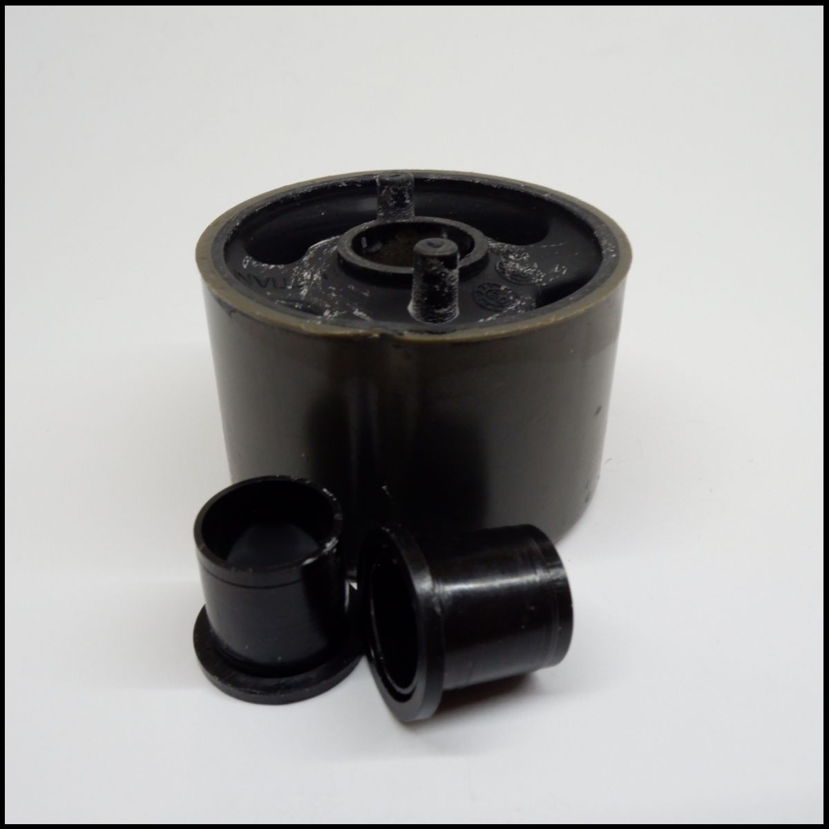 Peças plásticas pretas cilíndricas sobre fundo branco