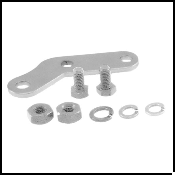 Conjunto de ferragens metálicas com parafusos, porcas, anilhas e placa prateada.