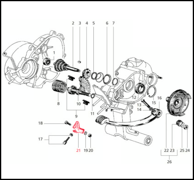 Desenho técnico de uma caixa de engrenagens e componentes numerados com peça em destaque a vermelho.