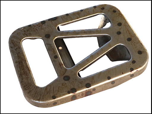 Peça metálica cinzenta com manchas escuras em fundo branco