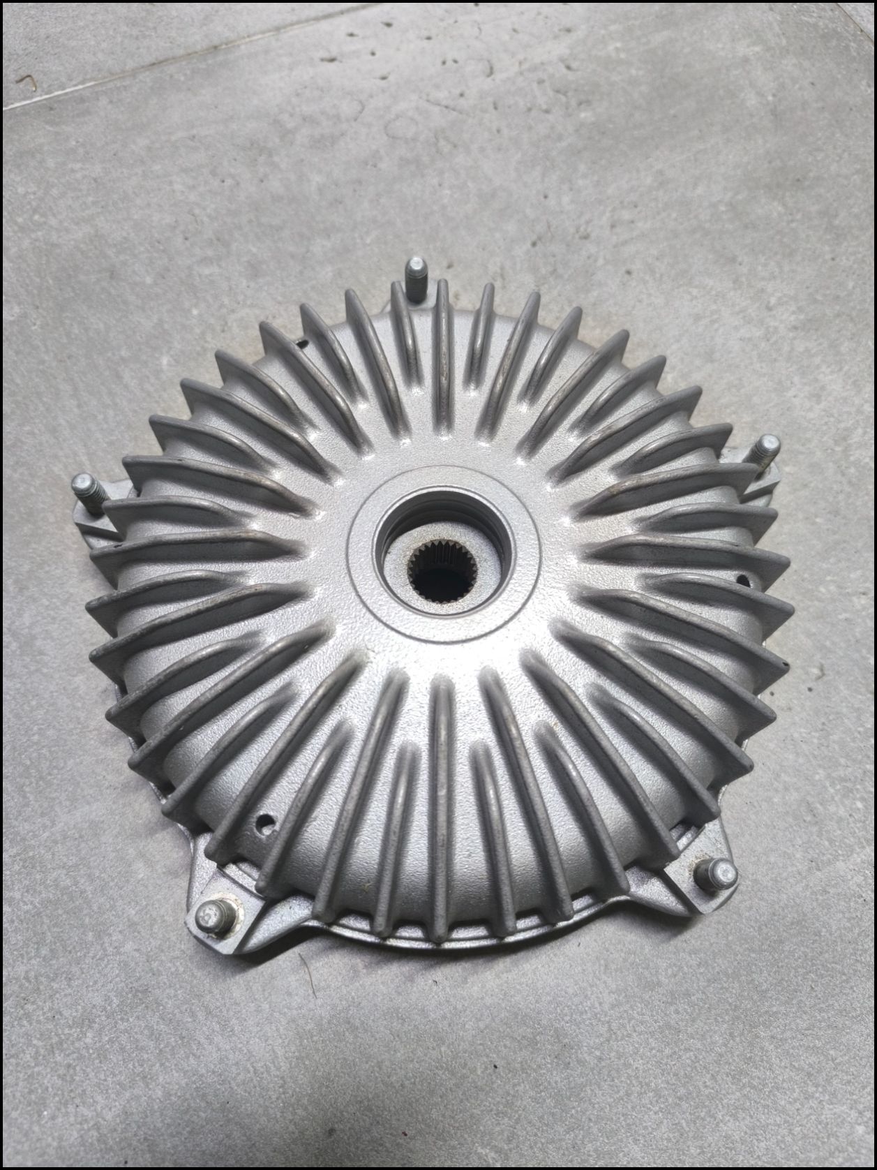 Peça metálica circular com aletas radiais cinzentas prateadas sobre superfície cinzenta