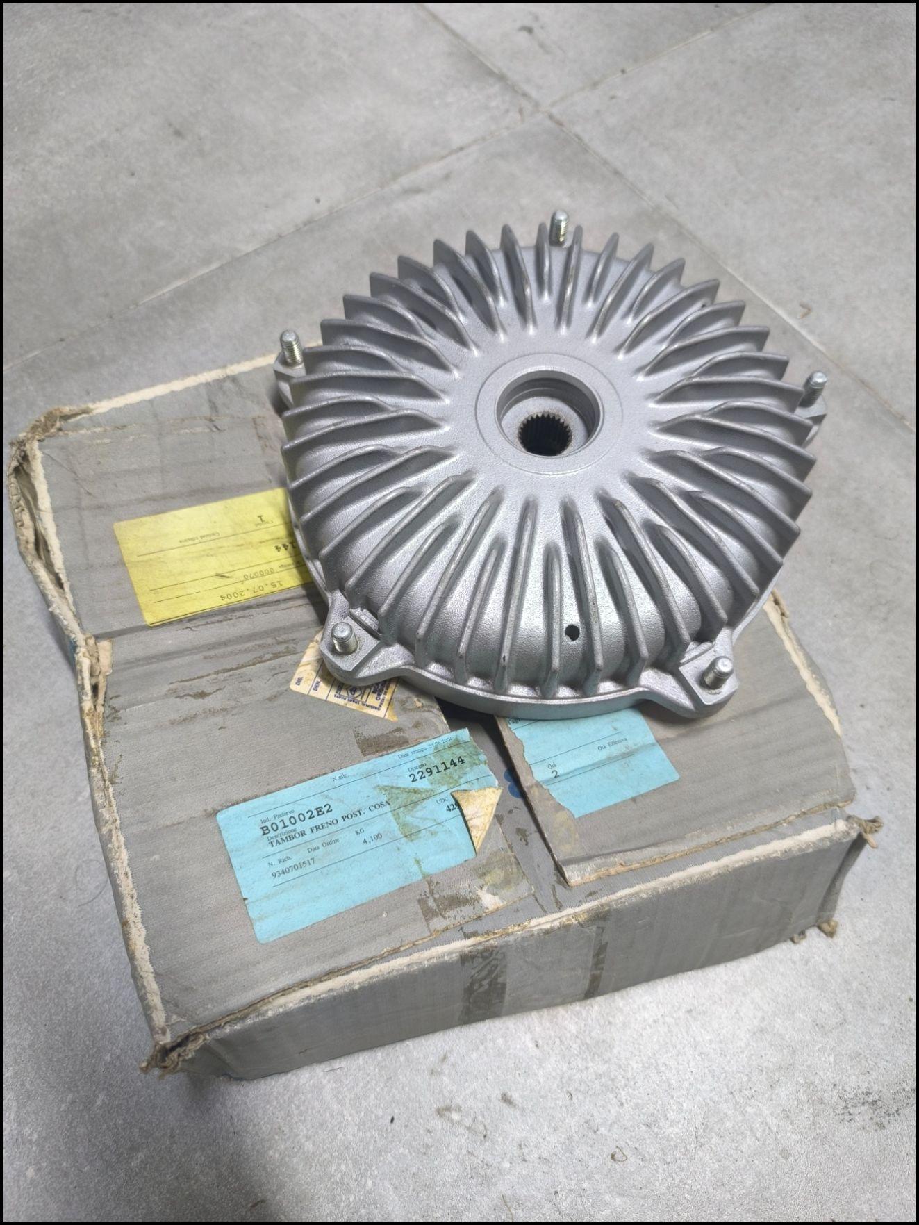 Peça metálica redonda com aletas radiais sobre caixa de cartão com etiquetas coloridas.