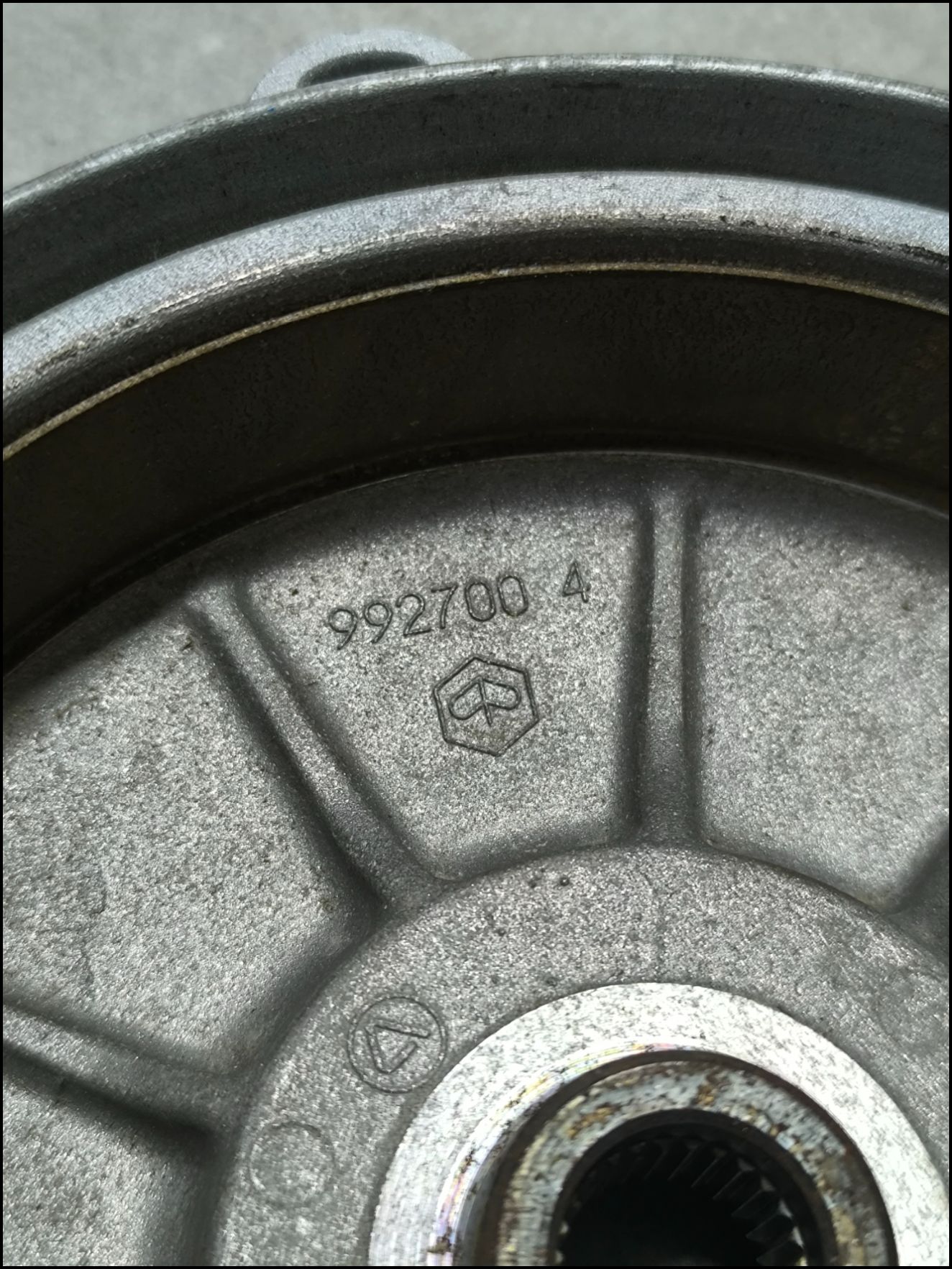 Peça metálica circular com número 992700 4 e textura rugosa