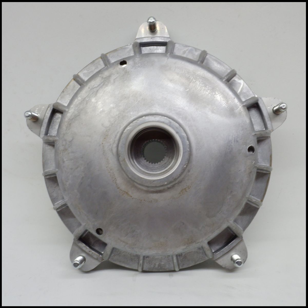 Disco metálico circular de cor prateada com detalhes estruturais e abertura central