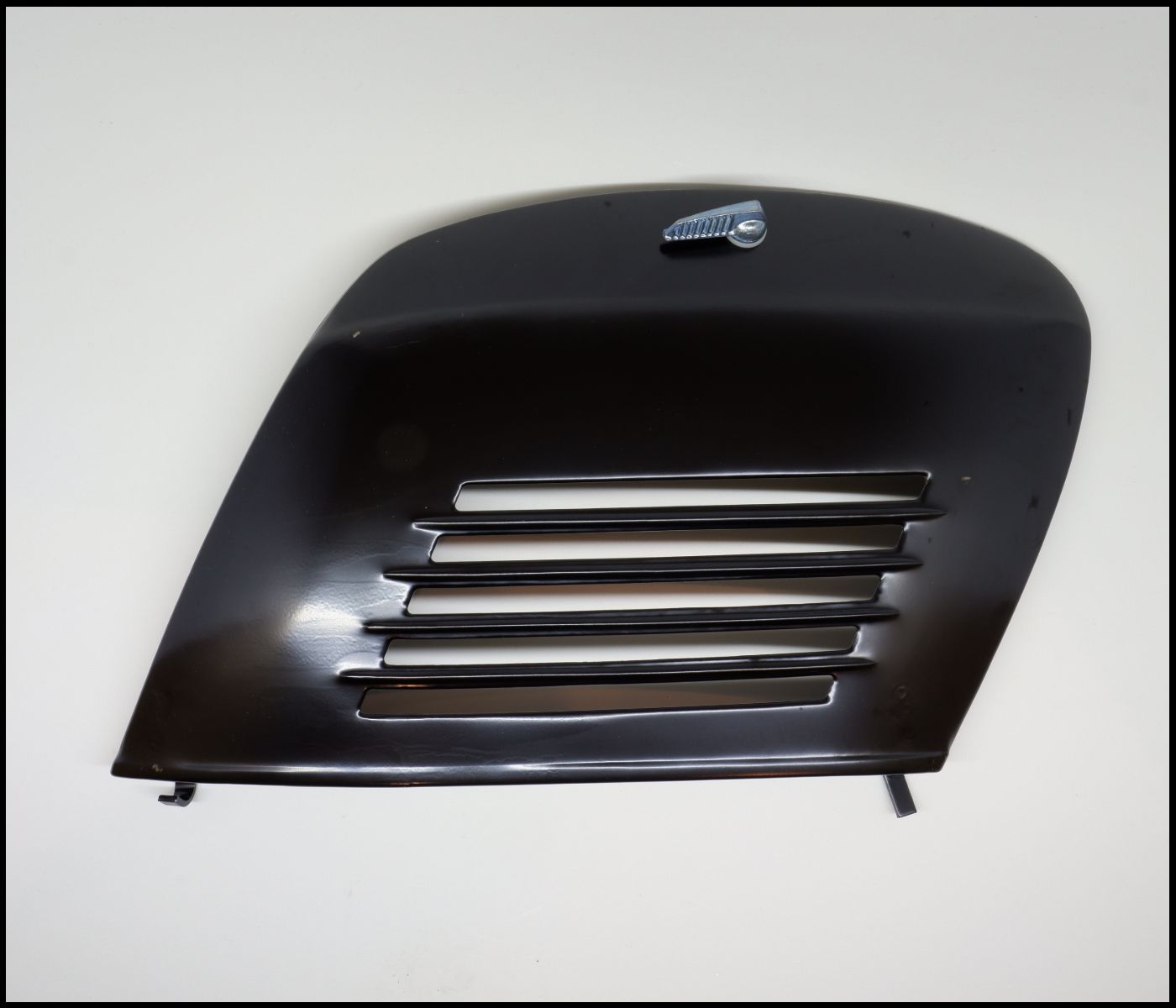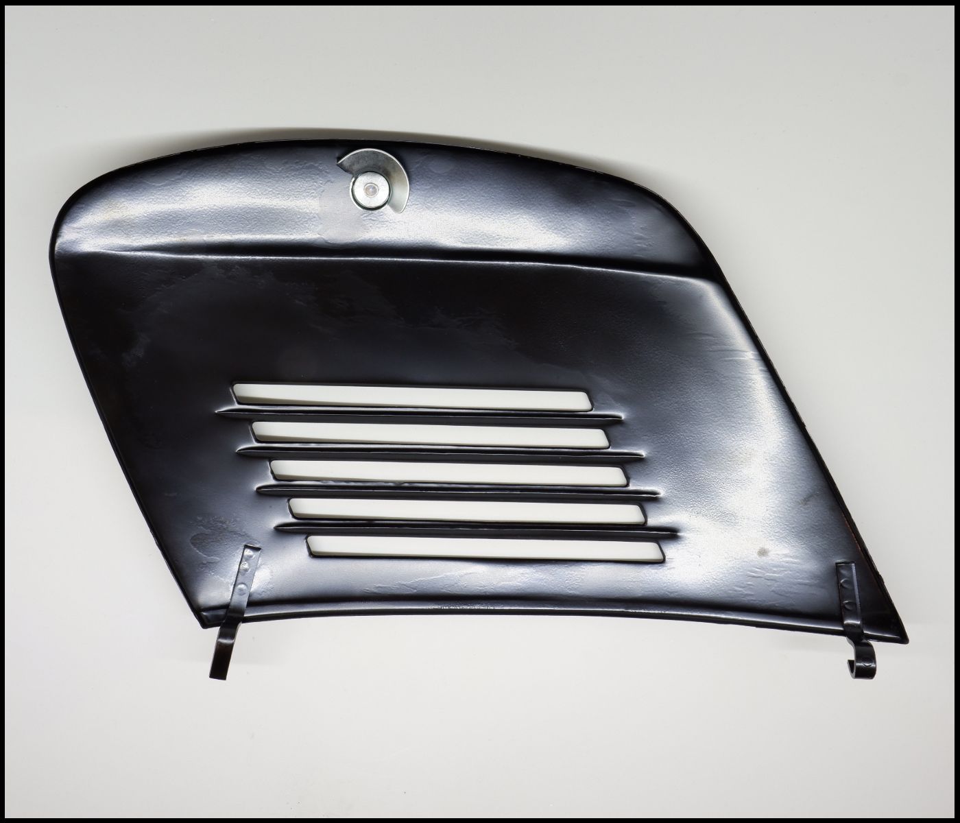 Peça lateral preta de motocicleta com ranhuras e fecho circular