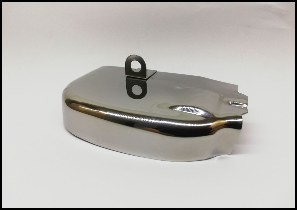 Peça metálica cromada com aba e orifício de fixação em superfície branca