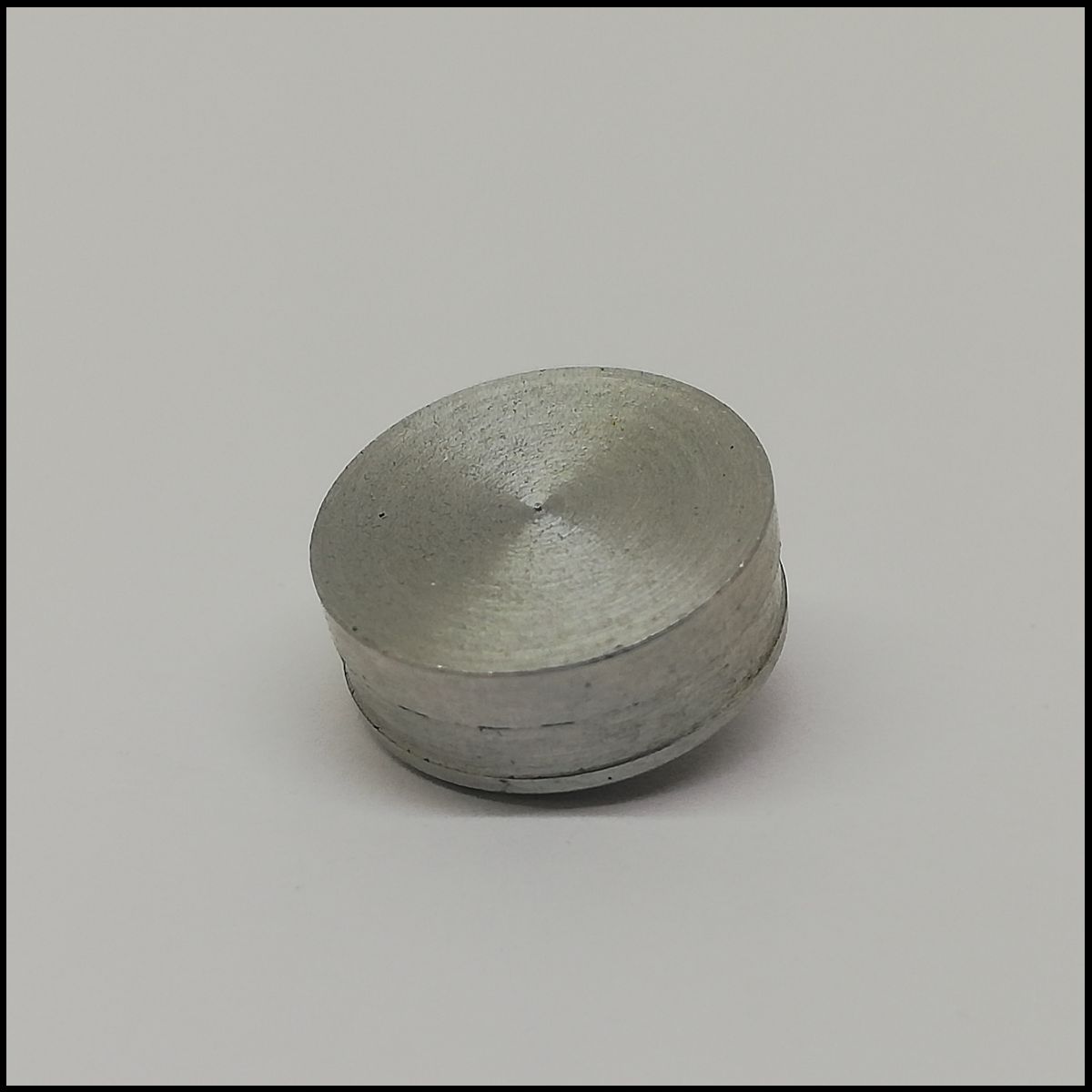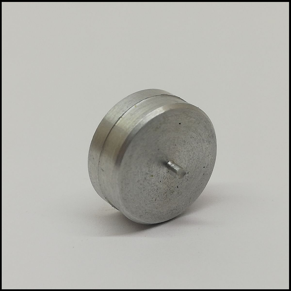 Peça metálica redonda prateada com pino central sobre superfície branca