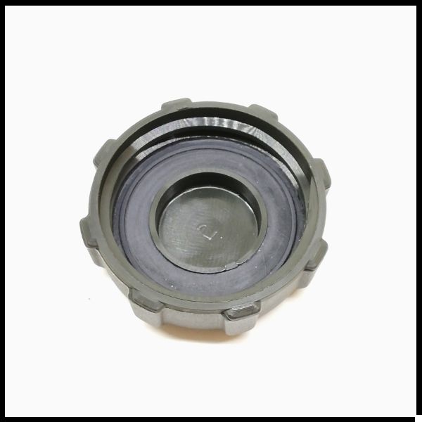 Tampa circular de plástico cinzento com selo de borracha preta