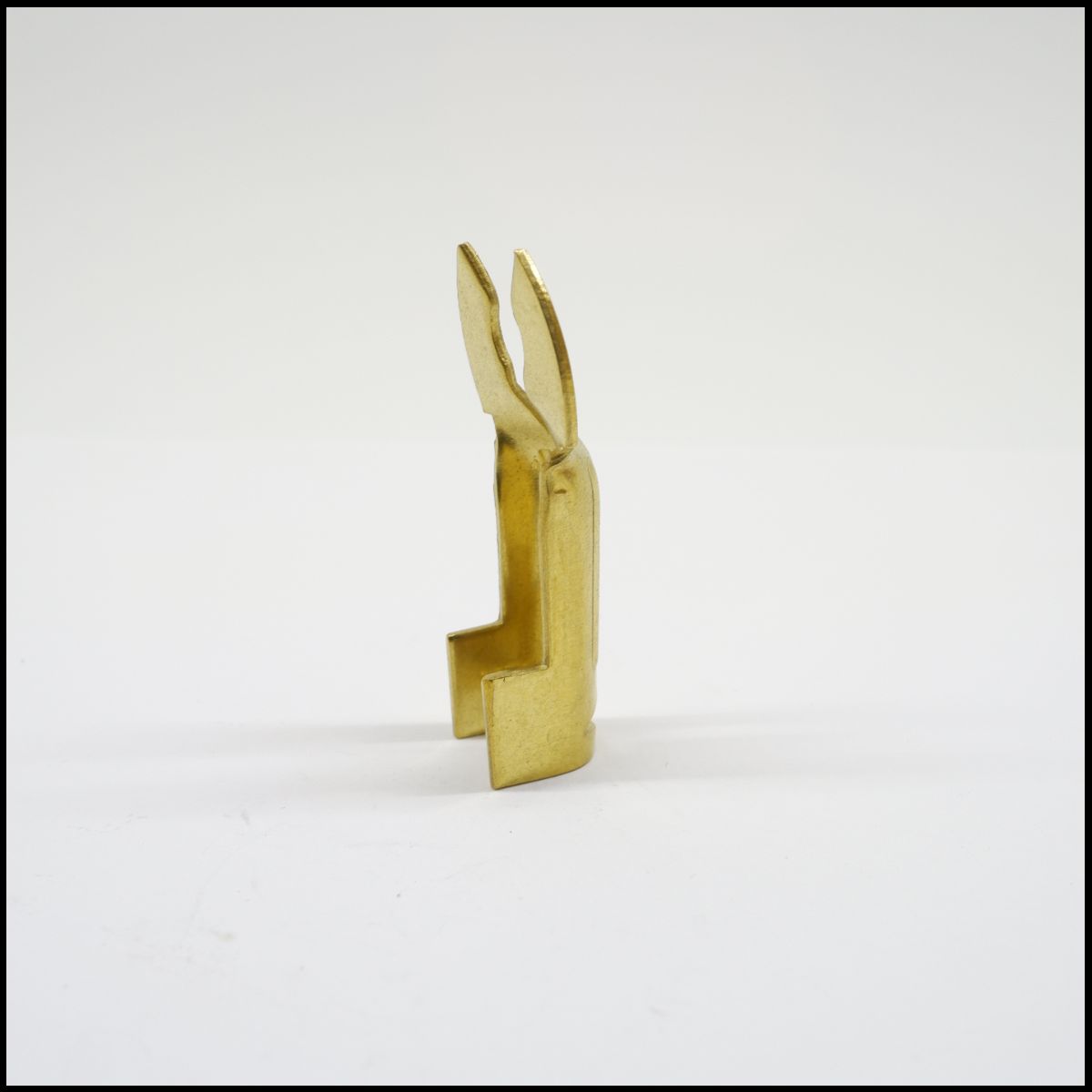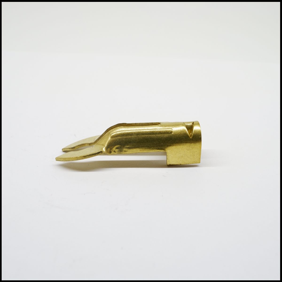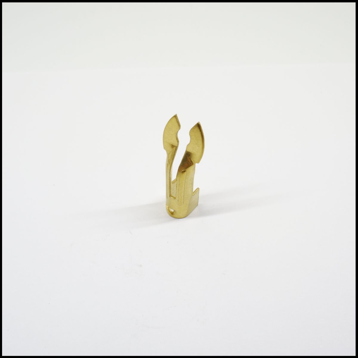 Terminal metálico dourado com duas pontas finas numa superfície branca