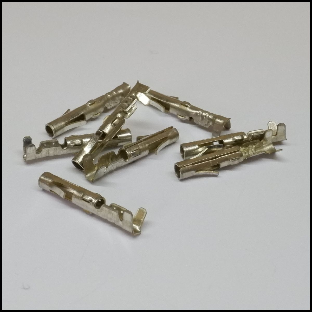 Terminais metálicos prateados pequenos sobre superfície branca