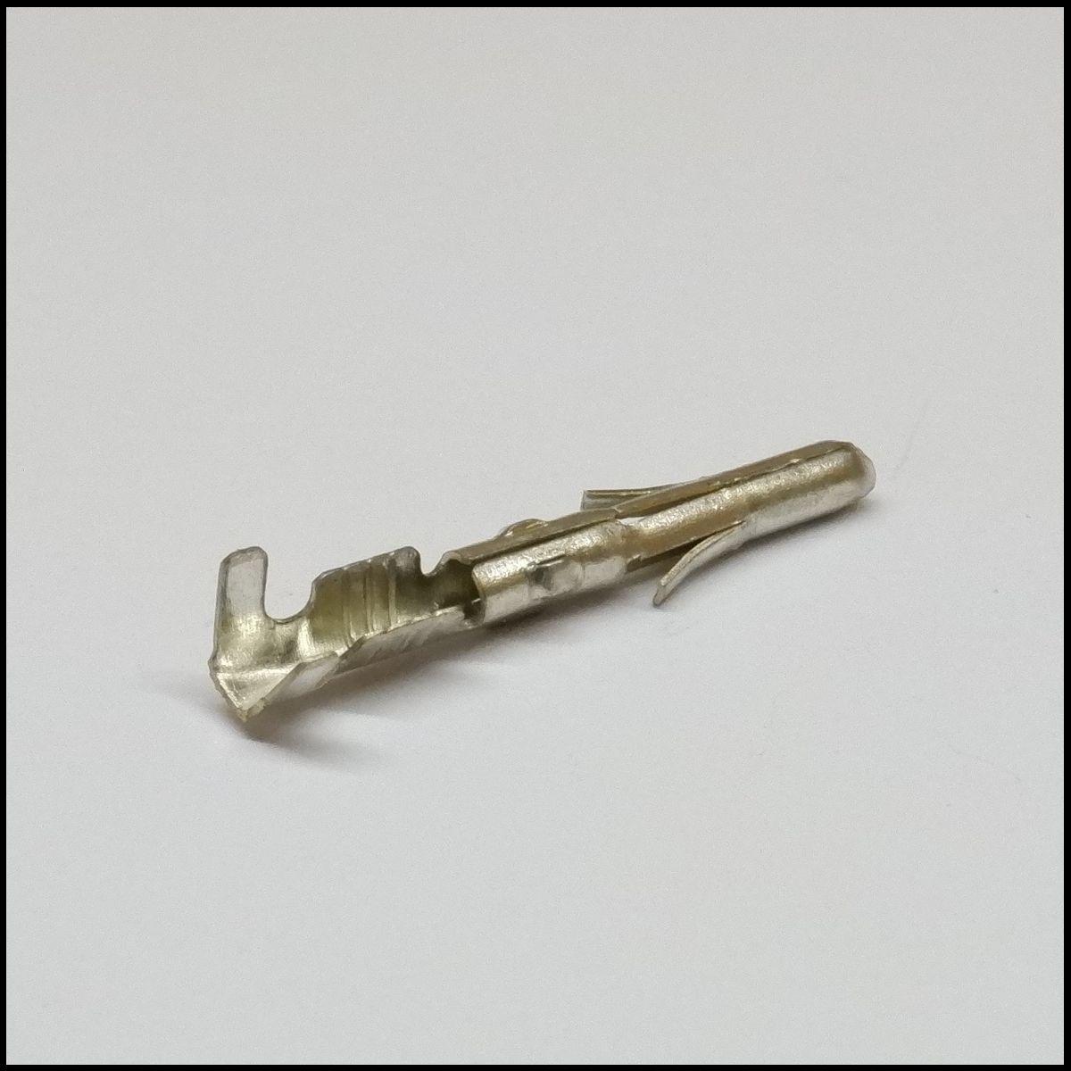 Conector metálico prateado sobre fundo branco
