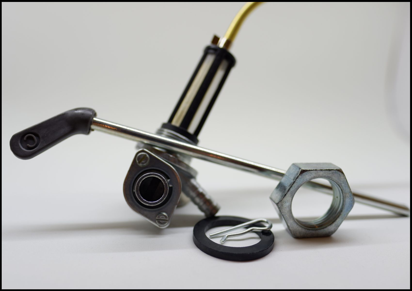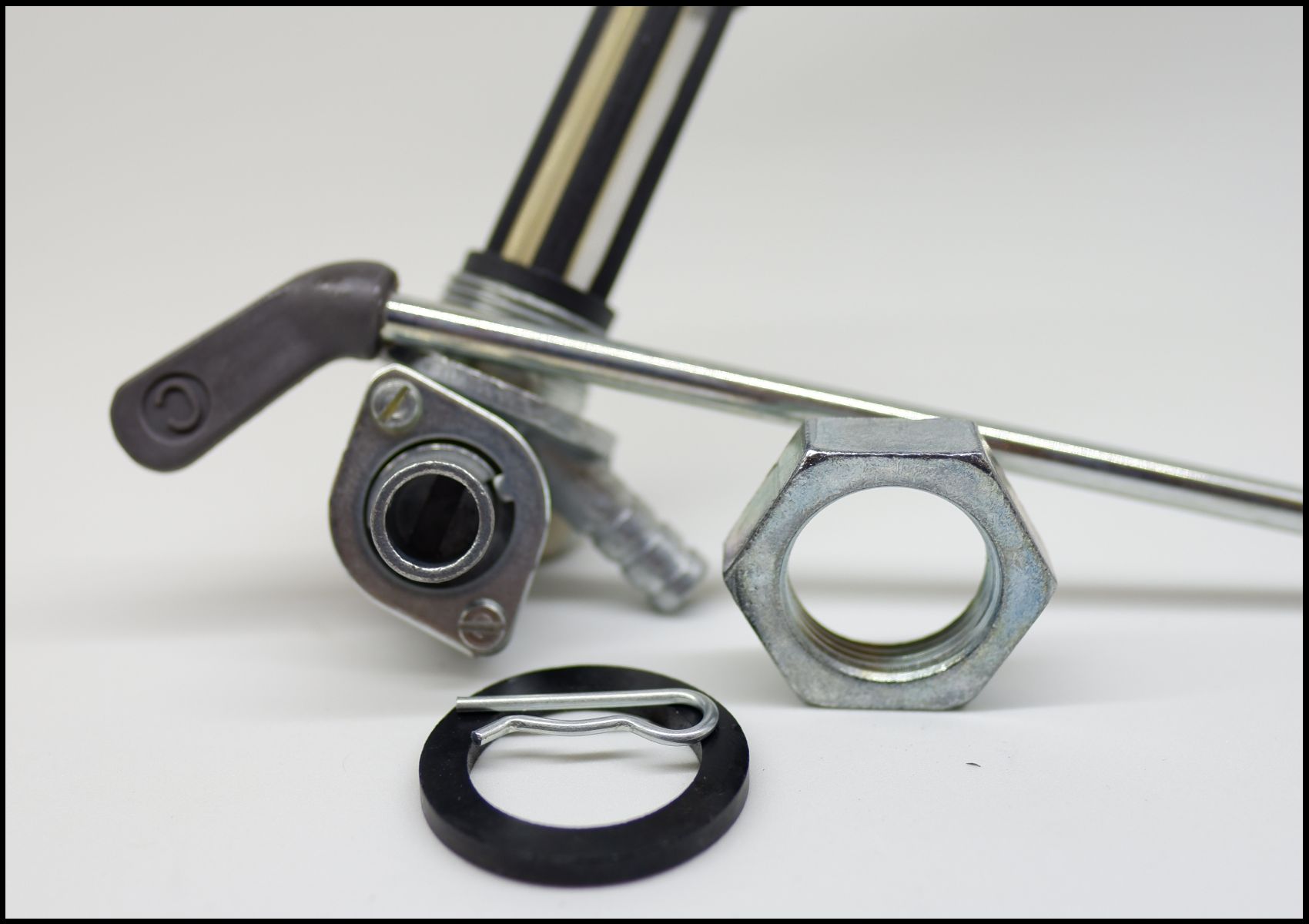 Componentes metálicos e plásticos, válvula com alavanca, porca hexagonal, mola e anel preto