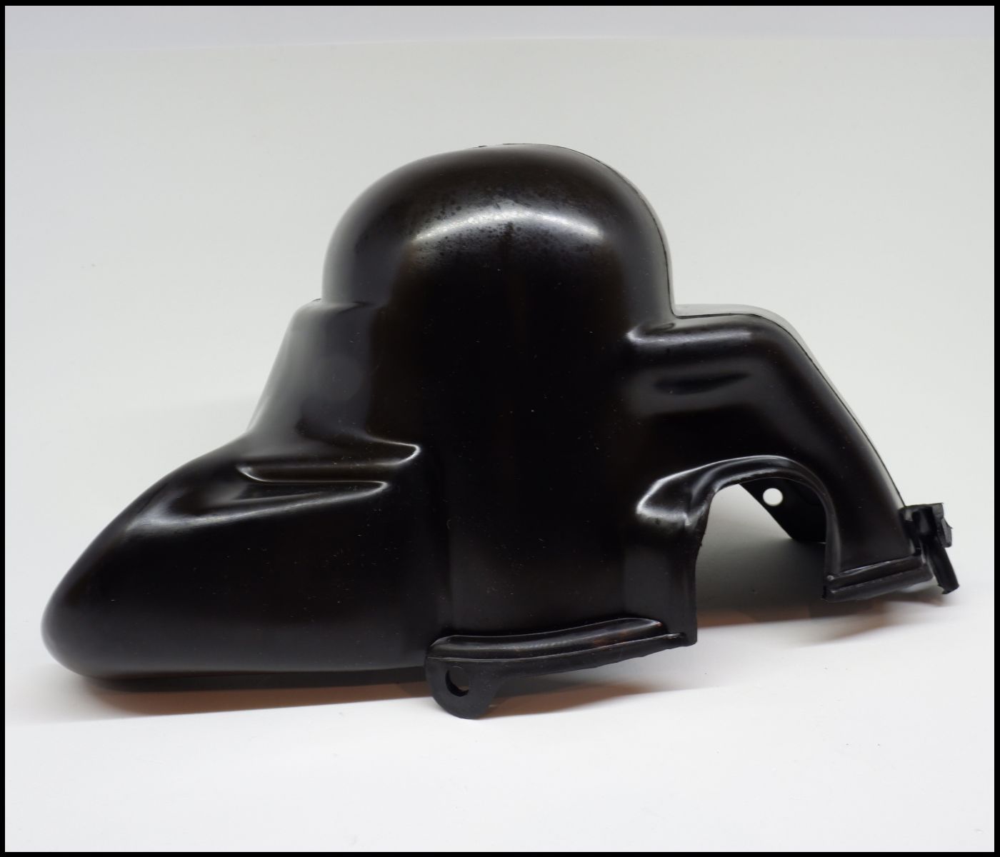 Capa plástica preta lisa com formato irregular sobre fundo branco