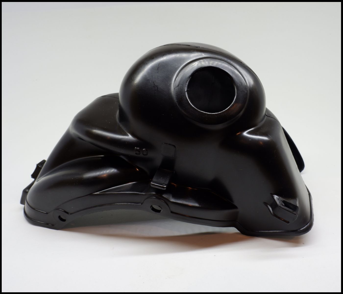 Tanque de combustível preto em plástico com entrada circular no topo