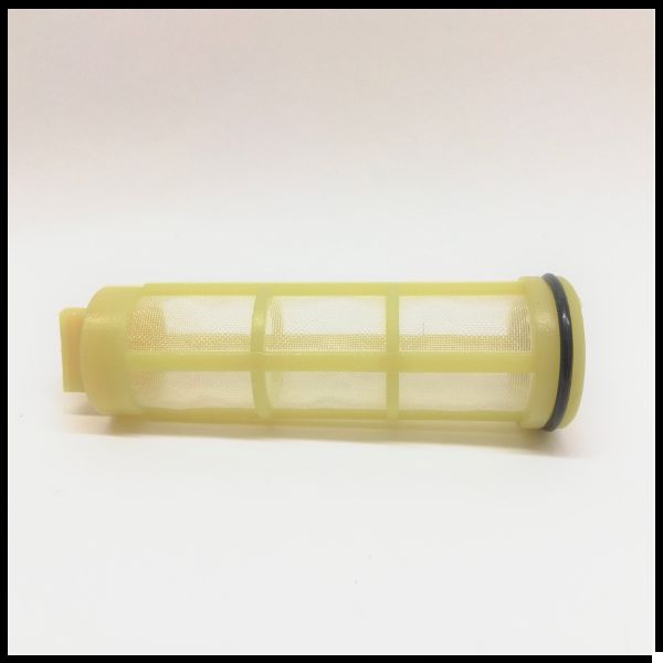 Filtro cilíndrico amarelo com malha e anel de vedação preto