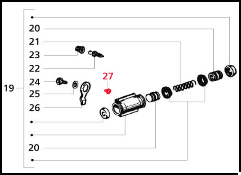 Diagrama técnico de peças mecânicas numeradas com destaque no número 27