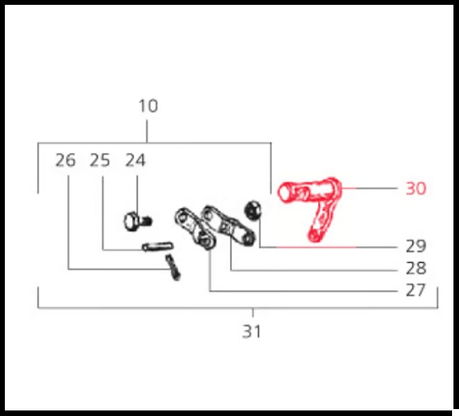 Diagrama técnico de peças mecânicas numeradas, uma em vermelho com número 30