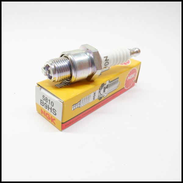 Vela de ignição NGK B9HS sobre caixa amarela vermelha